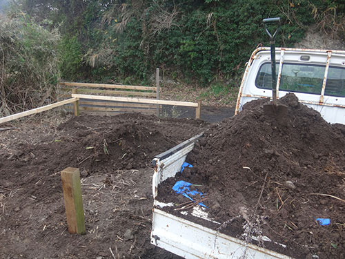 ウチの敷地は結構なデコボコや傾斜があるので、別の場所から土を運んで埋め込みました。