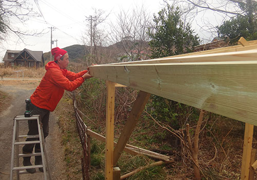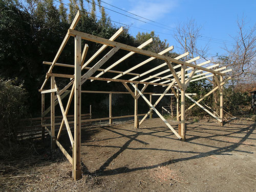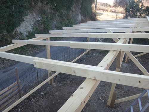 桁を乗せて、構造体が完成したら、次は垂木を渡して、屋根の下地を作ります。