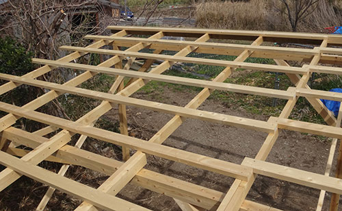 屋根の形状で一番簡単なのが、今回のような「片流れタイプ」。これなら、桁を繋ぐように垂木(2×4材)を渡していくだけで屋根の骨組みができます。
