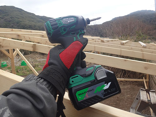 こちらは、ログハウス雑誌の取材で日立から借りた36ボルト(マルチボルト)のインパクトドライバー「WH36DA」。めちゃくちゃパワフルで、ビスの締め込みも楽々。しかも、防塵・防水仕様。なによりも、電池が長持ちするのがいいですね! 重量的にも18ボルトとそんなに変わらないので、新しく購入するならこれで決まりでしょう(^^ )