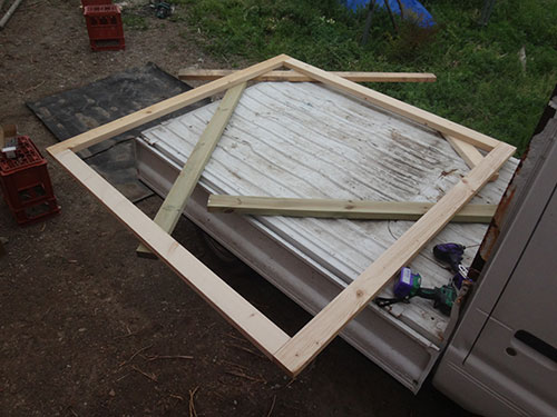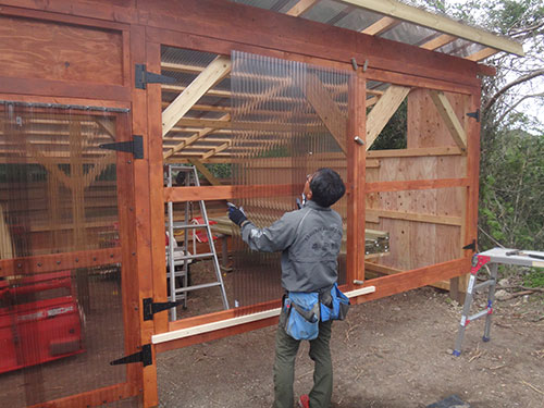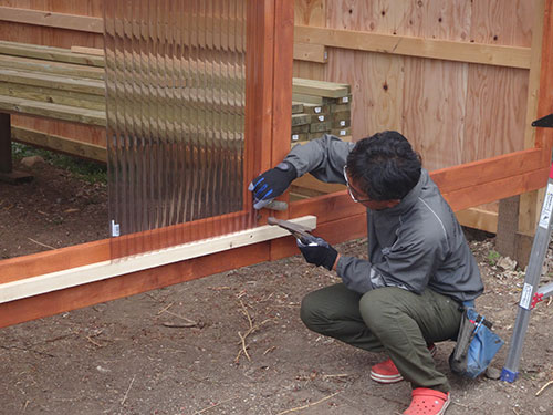 軽量化、かつ作業の簡易化を優先して、扉に張る材料は屋根材と同じポリカ波板にしました。