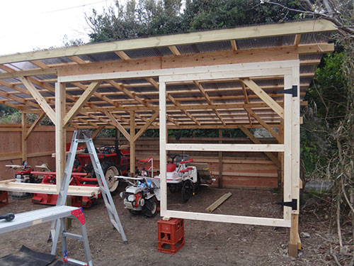 以前作った掘っ立て小屋では「吊り戸」にしたんですが、いろいろとメリットがある反面、構造上フルオープンできないのが難点でした!