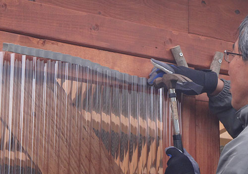 枠の下側に仮板を支えとしてビス留めしておくと、波板のズレがなくピッタリ張ることができます。